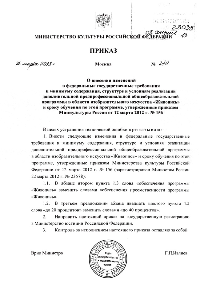 Приказ о внесении изменений в ФГТ Живопись