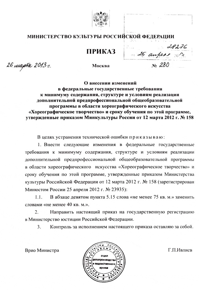 Приказ о внесении измениний в ФГТ Хореографическое творчество