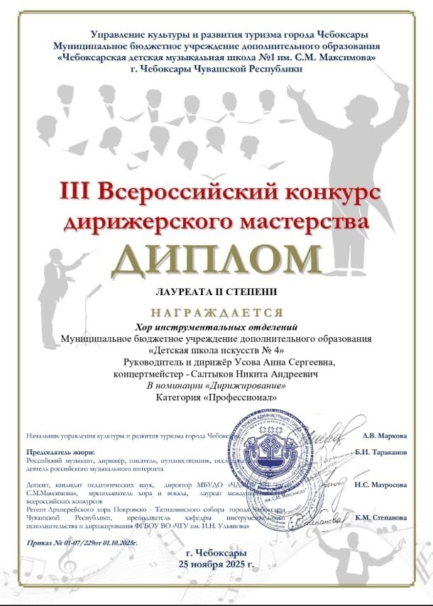 Особые слова благодарности — руководителю и дирижёру Анне Сергеевне Усовой и концертмейстеру Никите Андреевичу Салтыкову. Именно ваш профессионализм, вдохновение и преданность делу стали залогом этого яркого успеха.