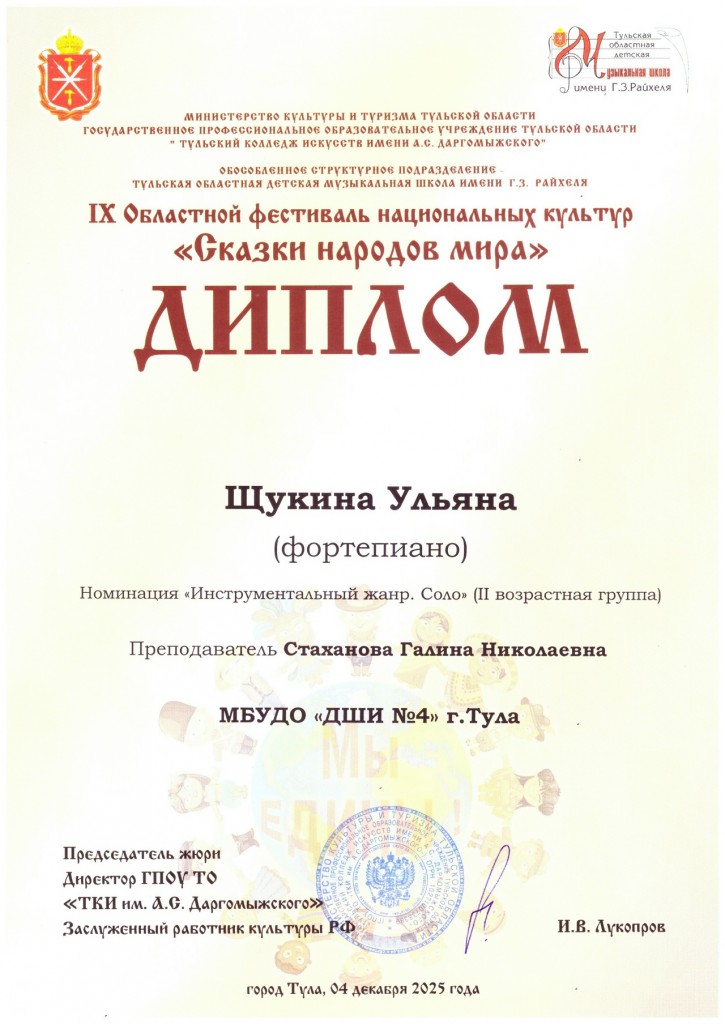 Щукина Ульяна - Дипломант (преп. Стаханова Г.Н.)