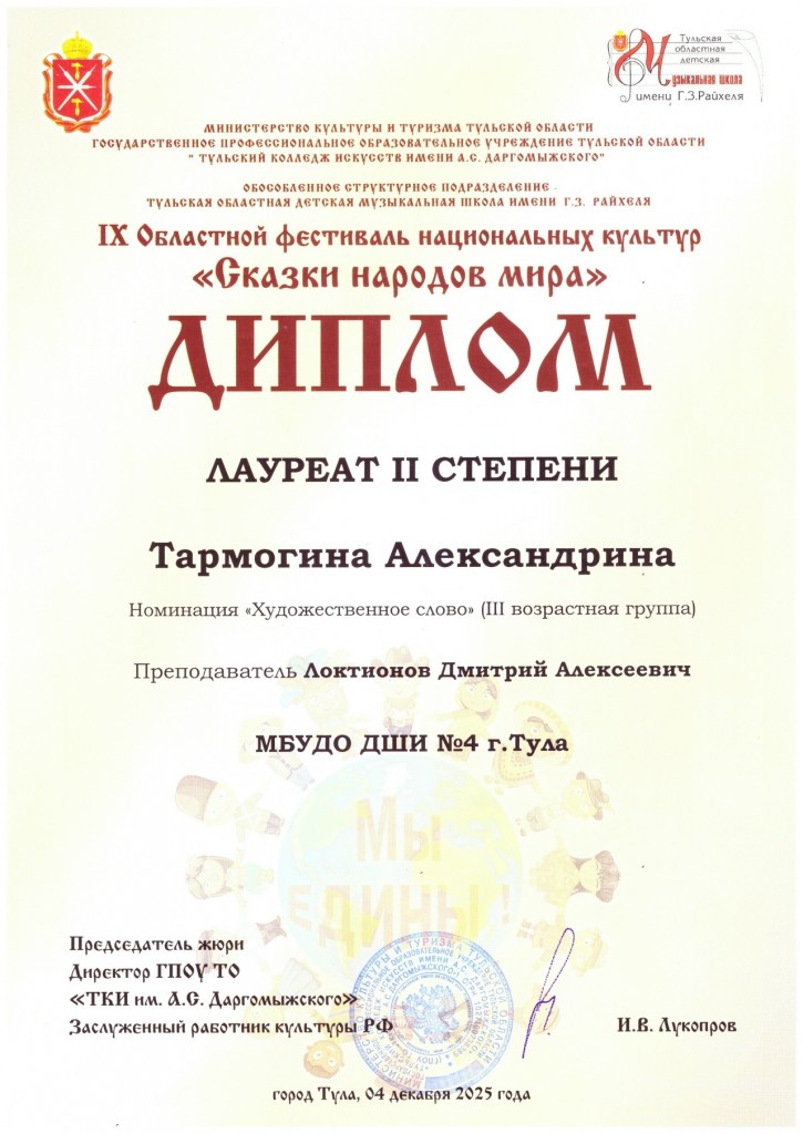Тармогина Александрина Лауреат 2 степени (преп. Локтионов Д.А.)