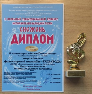 Поздравляем фольклорный ансамбль «Туда - сюда» (руководитель Жуков В.Ю.) с званием Лауреата 1 степени во II Открытом территориальном конкурсе исполнителей народной песни «СНЕЖЕНЬ».