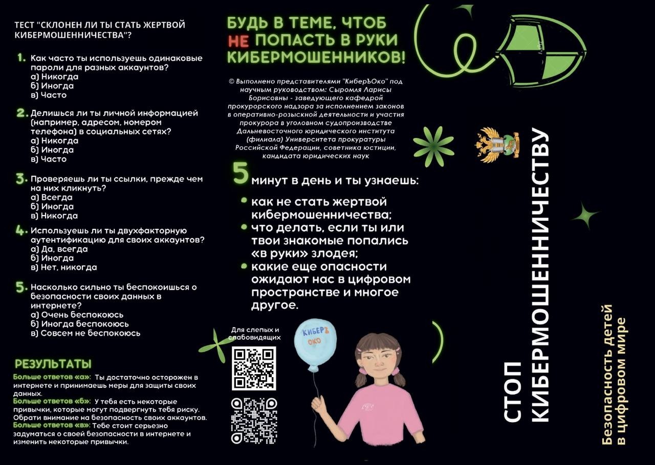 Генеральная прокуратура РФ усилила борьбу с киберпреступностью, запустив совместный проект с Дальневосточным юридическим институтом «КиберЪ Око». Проект включает выпуск памяток, проведение семинаров и тренингов, направленных на повышение цифровой грамотности и обеспечение безопасности граждан в сети.