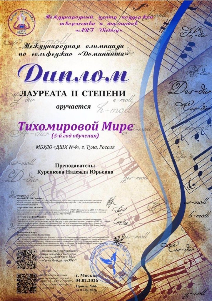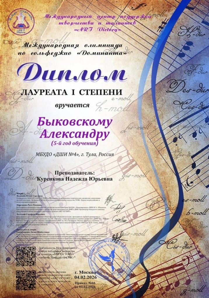 Поздравляем наших учащихся с хорошими результатами на Международной олимпиаде по сольфеджио «Доминанта»: