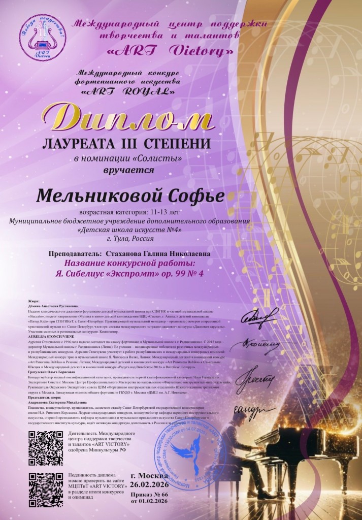 Поздравляем Софью Мельникову с отличным результатом на Международном конкурсе фортепианного искусства «ART Royal»!