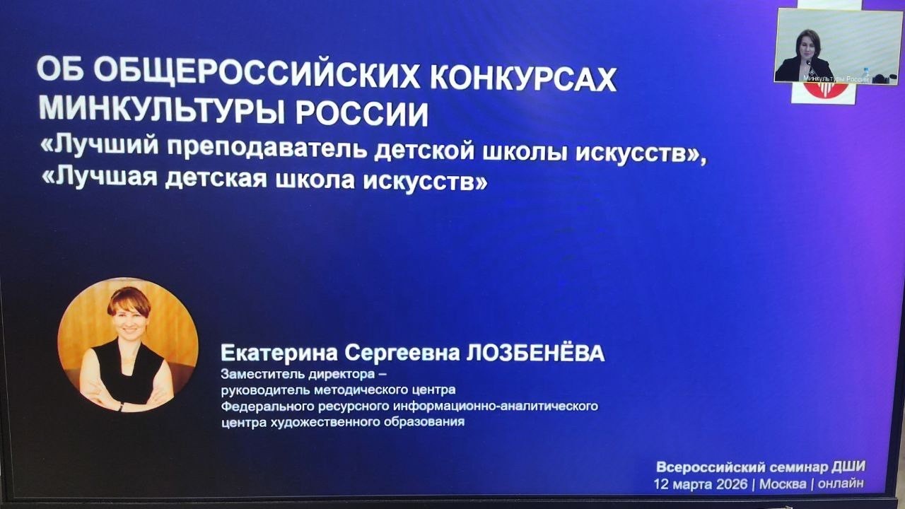 12 марта прошел Всероссийский семинар детских школ искусств, где обсудили вопросы государственной поддержки ДШИ, заполнения форм статистической отчётности, реализации Концепции дополнительного образования, а также проведения общероссийских конкурсов и конференций.