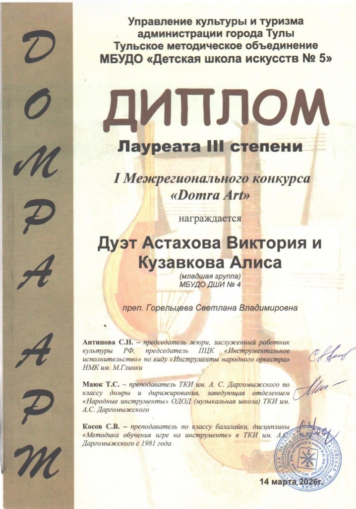 Звание Лауреата III степени присуждено дуэту: Астахова Виктория и Кузавкова Алиса (преподаватель — Горельцева С. В.).