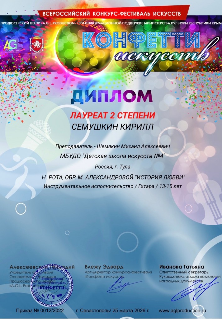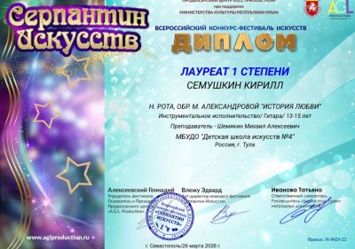 Поздравляем Семушкина Кирилла (преподаватель Шемякин М. А.) с отличными результатами на конкурсах: