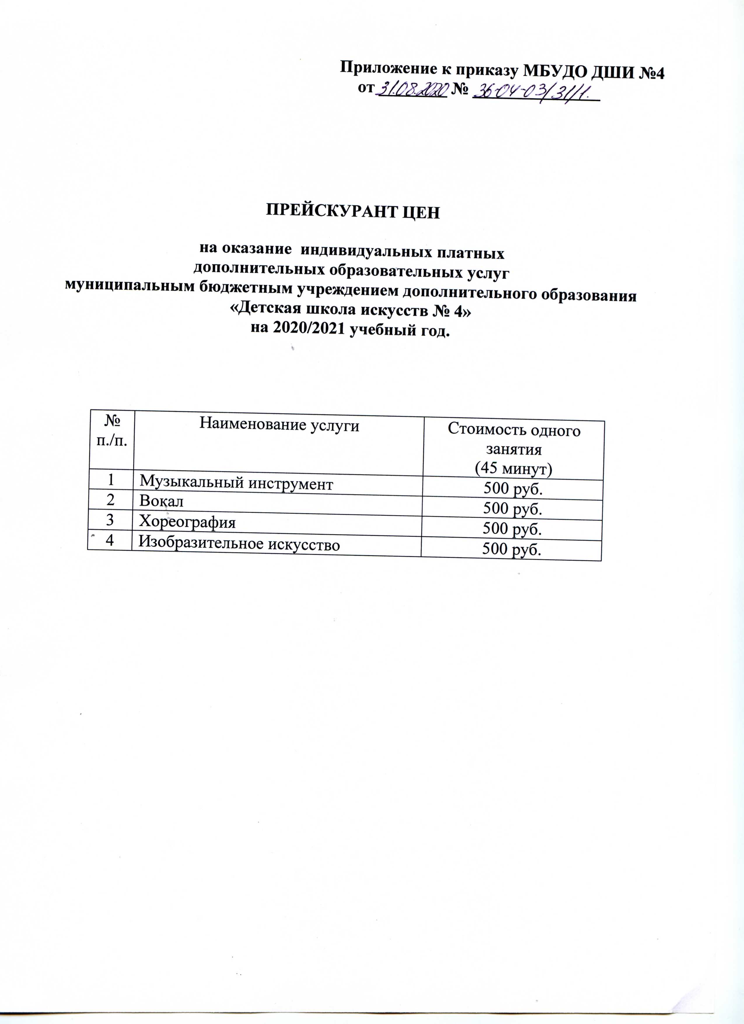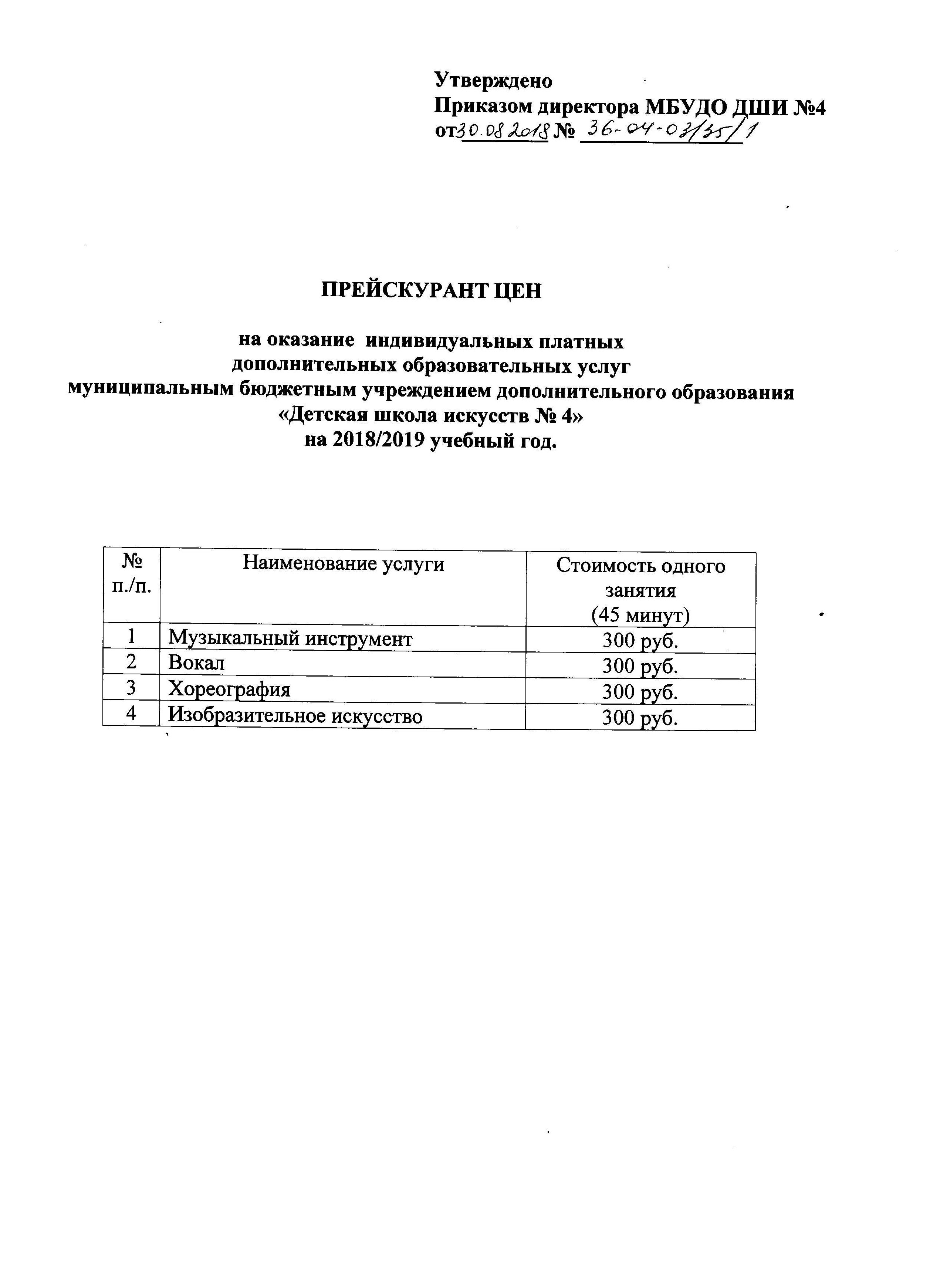 Приказ об утверждении прескуранта цен на 2020-2021 учебный год